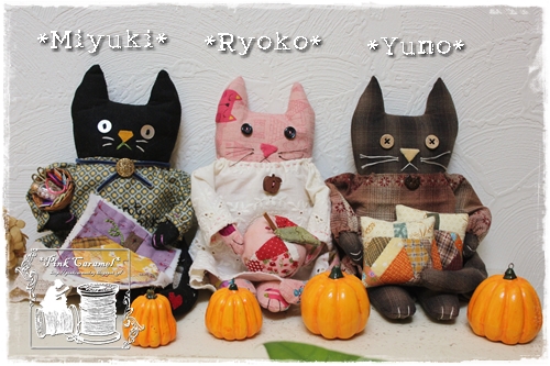 左から、みゆきさんのキティーちゃんはお裁縫道具のバスケットを抱えてかぼちゃのキルトを作成中。